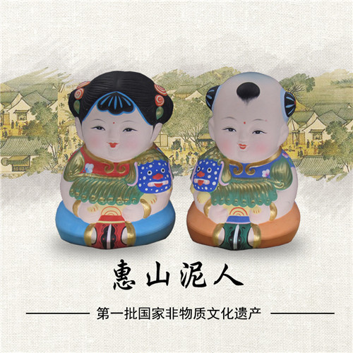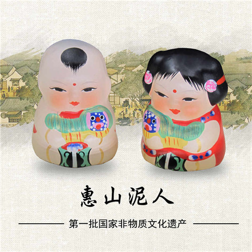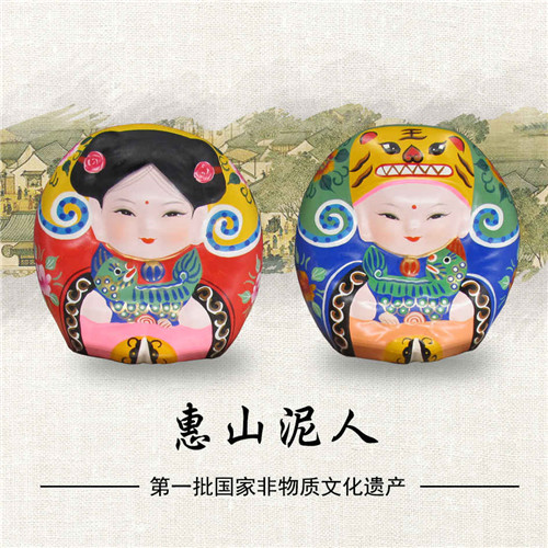 惠山泥人,是江苏无锡汉族传统工艺美术品之一,无锡三大著名特产之一。无锡当地艺人取惠山东北坡山脚下离地面约一公尺以下黑泥所制,其泥质细腻柔软,搓而不纹,弯而不断,干而不裂,可塑性佳,适合“捏塑”之用。惠山泥人以其造型饱满,线条流畅,色彩鲜艳,形态简练而蜚声中外,其精湛的工艺技巧和完美的艺术造型,凝聚了古代汉族劳动人民智慧和艺术的结晶。