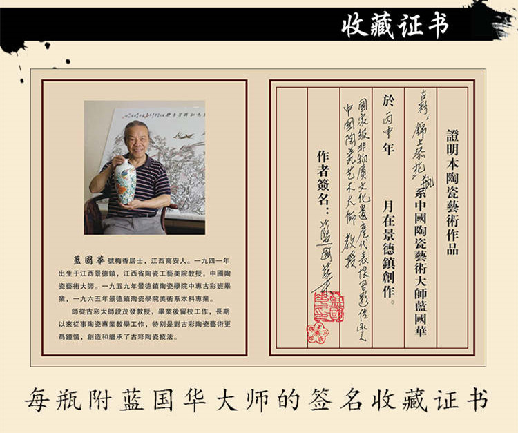 长期以来,蓝国华大师不仅对古彩艺术很是钟情,进行了一些技法上的大胆创新,还对青花、斗彩传统艺术进行新的尝试,开创了陶瓷装饰艺术新途径。 三槐堂文化的蓝国华大师的瓷器——锦上添花,该器型亭亭玉立,线条简洁,形似宋代梅瓶,端庄含蓄,既具传统美感又见时代隽美秀色。其釉质晶莹,胎体透亮,轻弹音色清脆如琴弦之音。